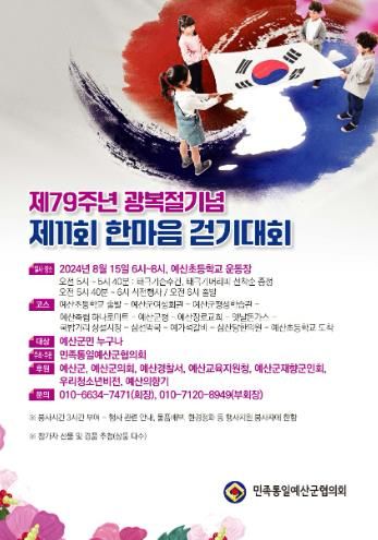 (아름다운교육신문) 예산군은 민족통일예산군협의회가 주관하는 제79주년 광복절 기념 한마음 걷기대회를 오는 8월 15일 예산초등학교에서 개최한다고 밝혔다.
