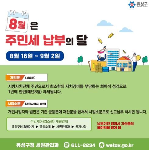 (아름다운교육신문) 대전 유성구는 8월 주민세 납부의 달을 맞아 9월 2일까지 주민세 신고·납부 기간을 운영한다.