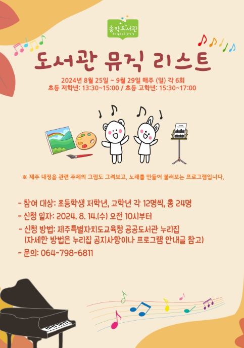 (아름다운교육신문) 제주도교육청 송악도서관은 예술 활동을 통해 학생들의 창의적 예술 표현 능력을 향상시키는 기회를 마련하고자 초등학생을 대상으로 ‘도서관 뮤직 리스트’ 프로그램을 운영할 예정이다.