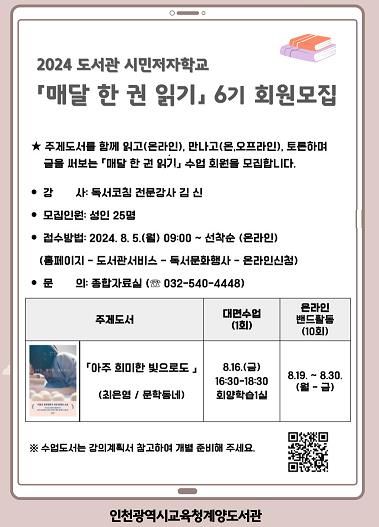 (아름다운교육신문) 인천광역시교육청계양도서관은 도서관 시민 저자 학교 프로그램의 일환으로 ‘매달 한 권 읽기’ 6기를 16일부터 30일까지 운영한다.