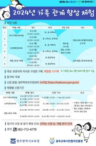 (아름다운교육신문) 광주교육시민협치진흥원은 오는 9월 28일까지 지역 유·초·중학생 가족을 대상으로 ‘2024년 가족 관계 향상 체험 프로그램’을 운영한다.