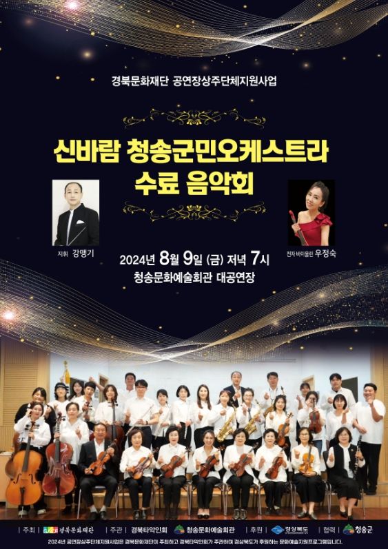 (아름다운교육신문) 청송군은 오는 8월 9일 금요일 오후 7시 청송문화예술회관 대공연장에서 ‘신바람 청송군민 오케스트라 수료 음악회’를 개최한다고 밝혔다.