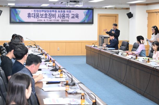 이번 교육은 휴대용 보호장비(웨어러블 캠)의 올바른 사용법과 운용기준, 보호장비 보안사항, 개인정보보호법 안내 등으로 진행됐으며, 교육 후에는 교육 참여자들과 함께 “악성민원인의 폭언·폭행으로부터 민원담당 공무원 보호”,“#악성민원 대응”등의 피켓을 들고 악성민원 근절 방지를 위한 피켓 챌린지도 펼쳐졌다.