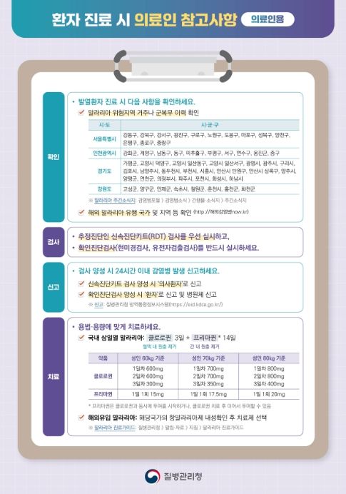 지영미 질병관리청장은 “위험지역 병·의원 등 의료기관에서는 증상이 의심되거나 이상적혈구가 확인되면 반드시 말라리아 확인검사를 시행하여 말라리아 퇴치에 동참해 줄 것”을 강조했으며, 또한, 말라리아 경보가 발령(8월 7일)됨에 따라 “위험지역의 주민과 방문자들은 증상이 경미 하더라도 두통, 식욕부진, 오한, 고열 등 말라리아 감염 의심 증상이 나타나면 가까운 보건소 또는 의료기관을 방문하여 적극적으로 말라리아 검사를 받아 주시길 바란다”고 당부했다.