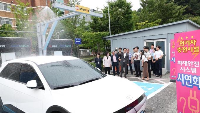 시연 방법은 전기차 충전 중 화재 상황을 재연한 화염을 화재 감지설비인 열화상카메라가 감지해, 알람신호를 모니터링 센터와 자동소화장치에 전달하고 소화약제를 상·하로 방수해 연소 확대를 저지하는 방식으로 재연됐다.