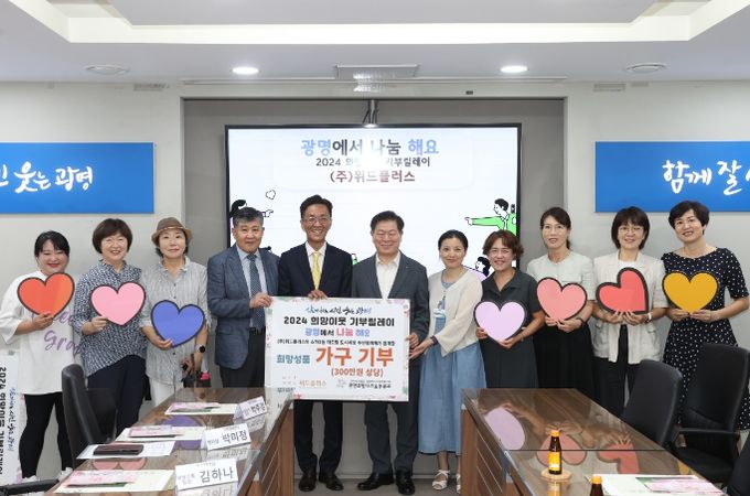 이번 기부릴레이 참여로 ㈜위드플러스는 수제 책장, 수납장 등 300만 원 상당의 가구를, 광명역사컨벤션웨딩홀은 희망성금 500만 원을, 오정옥 후원자는 희망성금 300만 원을 전달했다.