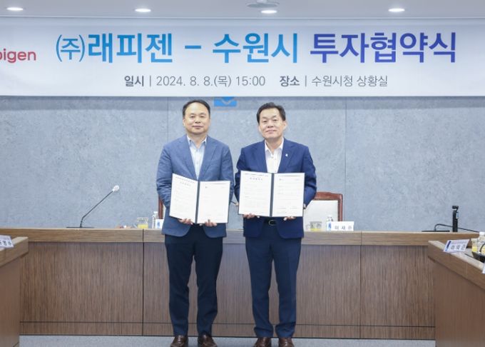 수원시와 ㈜래피젠은 8일 시청 상황실에서 투자협약을 체결하고, 협력을 약속했다. 협약식에는 이재준 수원시장, ㈜래피젠 박재구 대표 등이 참석했다.