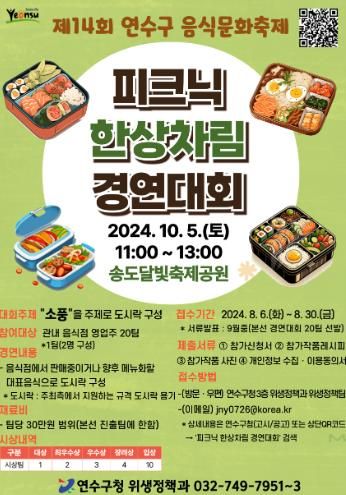 (아름다운교육신문) 연수구가 오는 8월 30일까지 연수구 대표 음식점 발굴과 지역 먹거리 관광의 활성화를 위해 제14회 연수구 음식 문화축제 ‘피크닉 한상차림 경연대회’ 참가자를 모집한다.