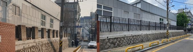 이번 공사는 학교 경계의 노후화된 벽돌 담장을 디자인이 적용된 담장으로 변경하고 줄기초 보수를 병행해 쾌적하고 안전한 교육환경을 조성하고자 진행했다.