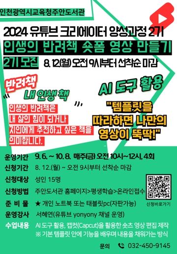 (아름다운교육신문) 인천광역시교육청주안도서관은 하반기 유튜브 크리에이터 양성 프로그램 ‘인생의 반려 책 숏폼 영상 만들기’를 9월 6일부터 운영한다.