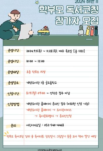 (아름다운교육신문) 인천광역시교육청계양도서관은 2024년 하반기 ‘학부모 독서 코칭’ 프로그램에 참여할 초등학생 학부모를 19일부터 모집한다.