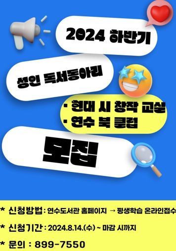 성인 독서 동아리 참여 신청은 8월 14일부터 연수도서관 누리집에서 할 수 있고, 자세한 내용은 도서관 누리집을 참고하거나 종합자료실로 문의하면 된다.