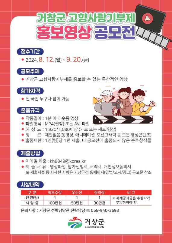 출품 영상형식은 1분 이내의 숏폼 형식으로, 1인(팀)당 1편을 제출할 수 있으며 거창군 고향사랑기부제를 독창적으로 알릴 수 있는 주제로 영상 콘텐츠를 제작해 이메일(kh8849@korea.kr)로 제출하면 된다.