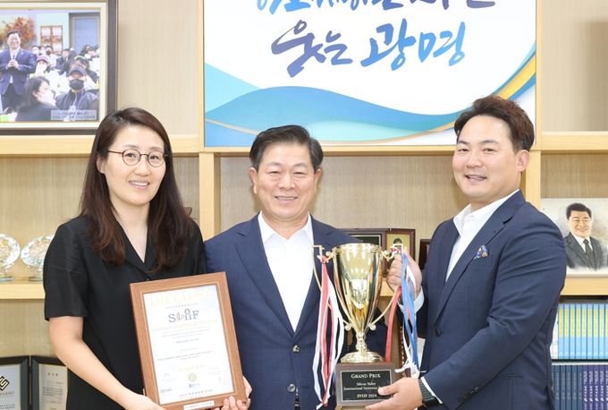 (아름다운교육신문) 박승원 광명시장은 지난 9일 시장실에서 ‘2024 미국 실리콘밸리 국제발명페스티벌’에서 발명품 대상을 수상한 관내 사회적기업 ㈜월드씨엔에스 조성현 대표, 김혜진 씨와 간담회를 가졌다.