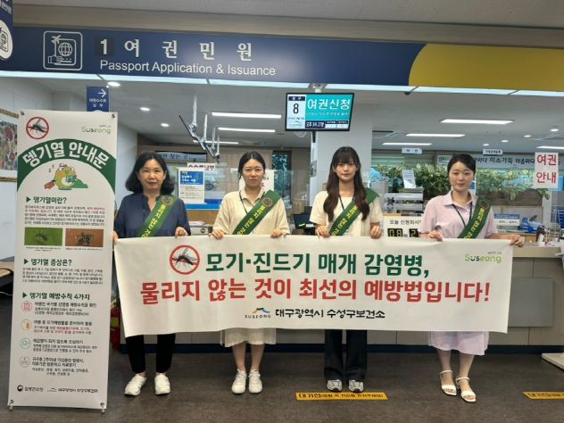 (아름다운교육신문) 대구 수성구는 지난 9일 여름 휴가철을 맞아 구청 내 여권발급 창구에서 해외여행객을 대상으로 뎅기열 예방 홍보 활동을 펼쳤다.