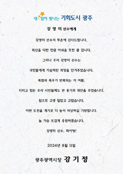 강기정 시장은 또 “이번 도전을 계기로 더 높이 비상하길 기원한다”며 “늘 가슴 뜨겁게 응원하겠다”고 말했다.