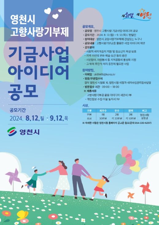 (아름다운교육신문) 영천시는 기부자가 공감하고 시민에게 실질적으로 혜택을 줄 수 있는 특색있는 기금사업 발굴을 위해 12일부터 고향사랑기부제 기금사업 아이디어 공모를 추진한다고 밝혔다.