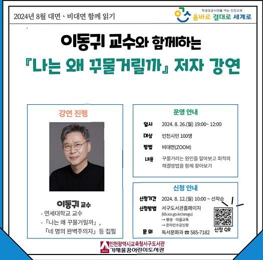 (아름다운교육신문) 인천광역시교육청서구도서관은 8월 ‘대면·비대면 함께 읽기’ 연계 프로그램으로 이동귀 교수의 ‘나는 왜 꾸물거릴까’ 강연을 오는 26일 오후 7시 비대면(Zoom)으로 운영한다.