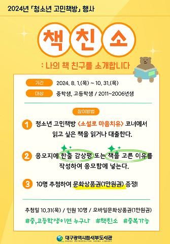 아울러,‘소설로 마음치유’에서 도서를 골라 읽거나 대출한 후 한줄 감상평이나 책을 고른 이유를 작성해 응모하면 추첨을 통해 문화상품권을 증정하는‘책친소: 나의 책 친구를 소개합니다’를 연계 행사로 운영한다.