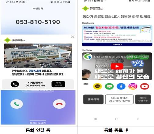 경산시는 행정전화를 스팸이나 보이스피싱으로 오인해 전화를 받지 않아 민원행정 처리가 지연됐던 부분을 해소하고, 행정전화 신뢰도 향상은 물론 다양한 시정 홍보를 할 수 있게 되었다.