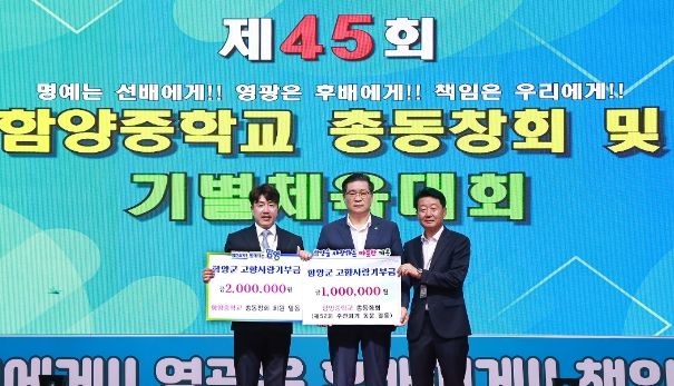(아름다운교육신문) 함양중학교 총동창회(회장 신창선)와 52회 주관회기(회장 이해윤) 동문들이 지난 10일 모교 교정에서 열린 ‘제45회 함양초등학교 총동창회’ 개회식에서 함양군에 고향사랑기부금 200만 원과 100만 원을 각각 기탁하며 고향 사랑을 실천했다.