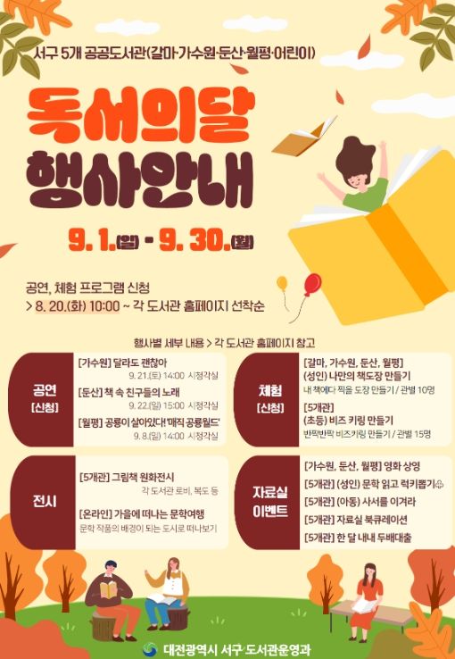 (아름다운교육신문) 대전 서구 5개 공공도서관(갈마·가수원·둔산·월평·어린이)은 9월 독서의 달을 맞아 공연, 전시, 자료실 이벤트 등 다양한 독서문화행사를 한 달간 운영한다고 13일 밝혔다.