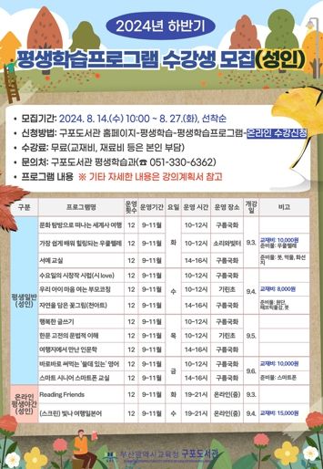 (아름다운교육신문) 부산광역시립구포도서관은 오는 9월부터 11월까지 초등학생과 성인 340명을 대상으로 구포도서관 등지에서 ‘2024 하반기 평생학습프로그램’을 운영한다.