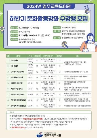 (아름다운교육신문) 명주교육도서관은 8월 13일부터 21일까지 유아와 초등학생을 대상으로 하반기 문화활동강좌 수강생을 모집한다.