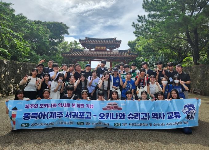 (아름다운교육신문) 제주도교육청 서귀포고등학교는 동북아역사재단 프로그램의 일환으로 8월 4일부터 8일까지 오키나와를 방문하여 제주와 비슷한 역사적 경험을 가지고 있는 오키나와의 슈리고등학교와 ‘제주와 오키나와 역사로 본 평화 기행’을 주제로 역사 수업 교류를 실시했다.
