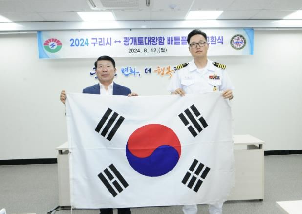 (아름다운교육신문) 구리시는 8월 12일 시장집무실에서 자매결연부대 해군1함대 광개토대왕함과 배틀플래그(Battle Flag) 교환식을 개최했다. ‘배틀플래그’란 군함이 작전 임무 수행 및 정박 중 게양하는 태극기를 뜻한다.