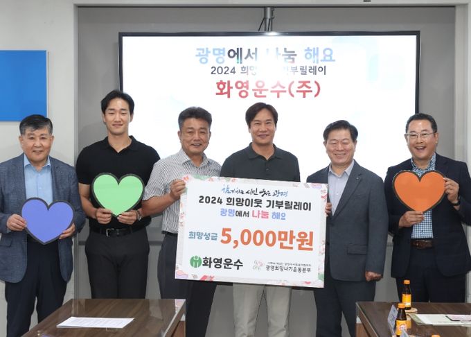 (아름다운교육신문) 광명시사회복지협의회는 13일 오전 시청 영상회의실에서 광명희망나기운동사업의 ‘2024 희망이웃 기부릴레이’에 참여한 ▲화영운수 ▲자경마을버스 ▲정순옥, 이종능 개인 후원자와 희망성금·물품 전달식을 개최했다.