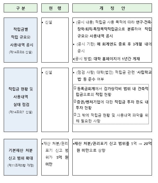 첫째, 국민의 알 권리를 충족하기 위해 사립대학과 학교법인이 적립금 규모와 사용내역을 매 회계연도 종료 후 3개월 이내에 대학 누리집(홈페이지)에 1년간 게재하도록 의무화했다(시행령 제14조의6).