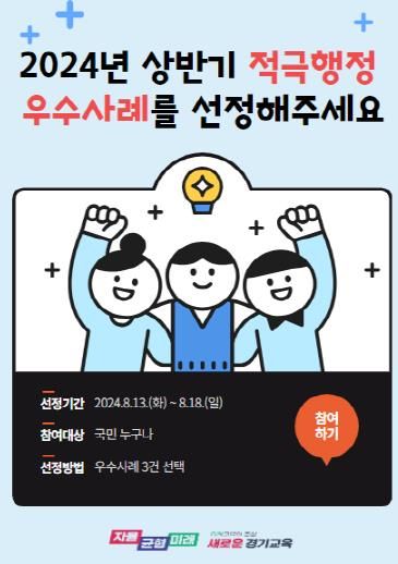 경기도교육청은 공공의 이익을 위해 업무를 적극적으로 추진해 국민이 체감하는 성과를 창출한 적극행정 우수사례를 선정하기 위해 올 상반기부터 대국민 심사를 실시한다.