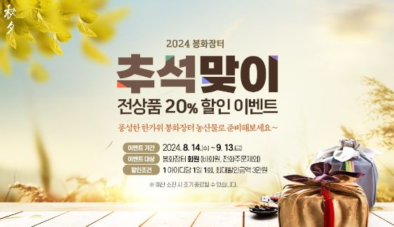 (아름다운교육신문) 봉화군농업기술센터는 추석을 맞이해 봉화군 농특산물 쇼핑몰인 ‘봉화장터’에서 할인 이벤트를 진행한다.
