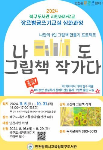 (아름다운교육신문) 인천광역시교육청북구도서관은 인천시교육청 읽걷쓰 사업의 일환으로 시민의 지속적인 독서 활동을 장려하기 위해 시민 저자 학교 6기 ‘나도 그림책 작가다’ 참여자를 16일부터 모집한다.