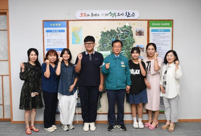 14일 완주군은 최근 군수실에서 이달 초 선출된 소율 의장(완주고 · 2)과 이예담 부의장(완주중 · 2), 심아현(완주중 · 2) 서기와 유희태 완주군수가 면담을 가졌다고 밝혔다.