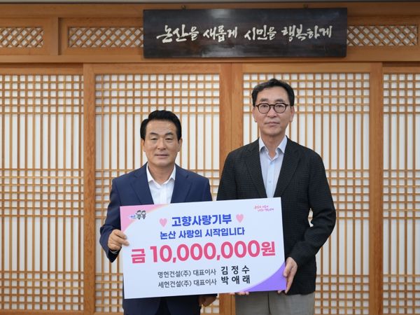 (아름다운교육신문) 명헌건설(주) 김정수 대표이사와 세헌건설(주) 박애래 대표이사가‘고향사랑기부금’개인 최대금액인 500만원씩, 총 1천만원을 논산시에 기부하며 남다른 고향 사랑을 보였다.