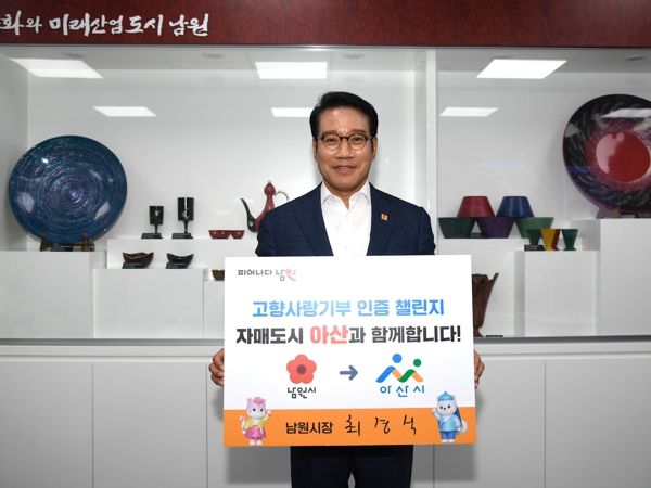 ‘고향사랑기부 인증 챌린지’는 고향사랑기부제 참여 활성화를 위해 진행됐으며, 최경식 남원시장은 자매도시인 여주시의 이충우 시장의 지명을 받아, 자매도시 간 상생발전과 기부 참여 분위기 확산을 위해 챌린지에 참여하게 됐다.