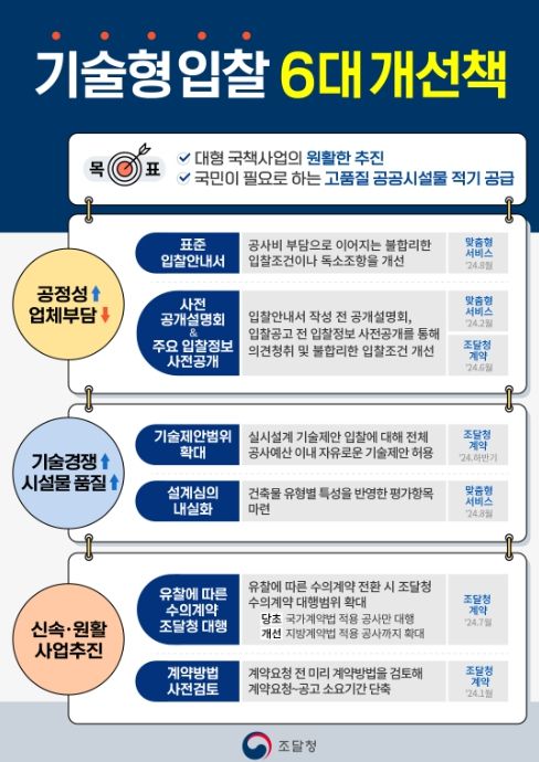 (아름다운교육신문) 조달청은 대형 건설공사의 원활한 추진을 지원하기 위해 기술형 입찰 입·낙찰제도와 집행 절차·방법 전반에 걸쳐 종합적인 개선 조치를 시행한다.