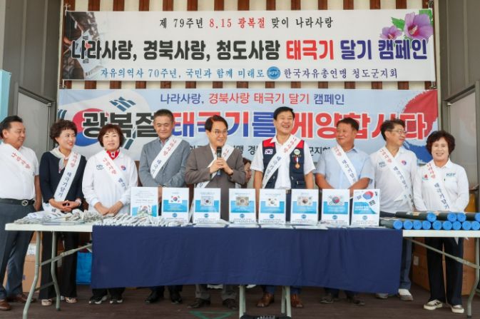 (아름다운교육신문) 청도군은 14일 한국자유총연맹 경북도지부(회장 이우경)와 청도군지회(회장 조인제)가 함께 제79주년 광복절을 맞이하여 청도시장 야외무대에서 김하수 청도군수, 이우경 한국자유총연맹 경상북도지회 회장, 조인제 청도군지회 회장 등 회원 20여 명이 모여'나라사랑, 경북사랑, 청도사랑'태극기 달기 달기 캠페인을 개최했다고 밝혔다.