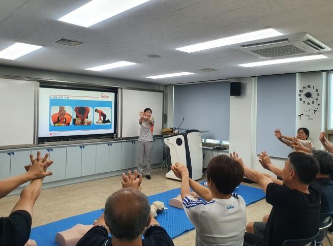센터는 지난 4월부터 무료 평생교육 상설 프로그램의 일환으로 센터 종사자 및 이용회원 대상으로 응급처치 교육강좌를 개설, △응급처치 이론 △심폐소생술 실습 △자동심장충격기 활용법 등을 가르쳐 왔으며 좋은 평가를 받았다.