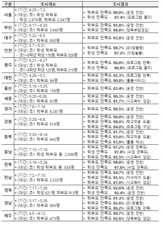 또한, 초1 교실을 학생들이 안전하게 머무를 수 있는 아동친화적 환경으로 개선하고, 프로그램 운영 중 교사들이 머무를 수 있는 교사연구실도 구축 중이다. 8월 9일 기준 교실 6,485실 환경 개선 및 교사연구실 4,453실 구축이 완료됐고, 교육청-지자체 협력 등을 통해 학교 밖 공간도 확보했다.