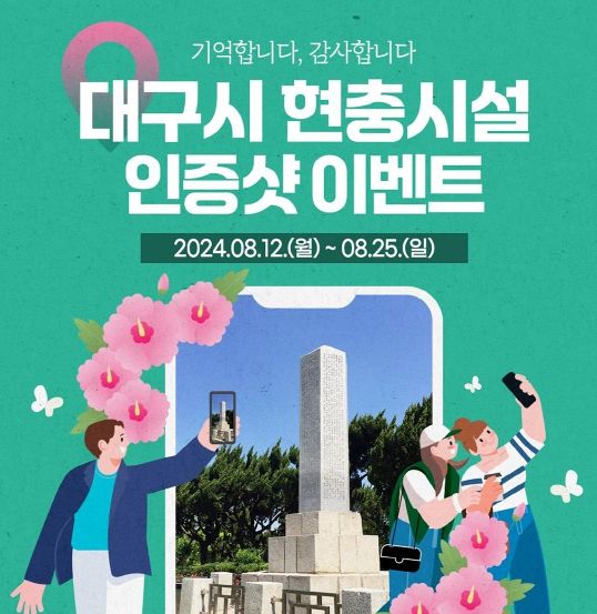 한편, 대구시는 광복절을 맞아 나라를 위해 희생하신 국가유공자들의 숭고한 정신을 기리고, 현충시설 방문을 활성화하고자 8월 부터 8월 25일까지 현충시설 인증샷 이벤트를 진행한다.