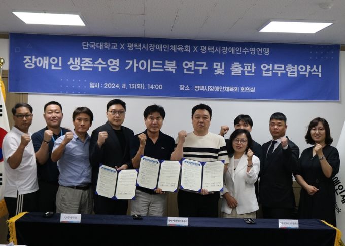 (아름다운교육신문) 평택시 장애인체육회는 지난 13일(화) 단국대학교와 평택시 장애인수영연맹과 함께 ‘장애인 생존수영 가이드북 연구 및 출판 업무협약’을 체결했다고 밝혔다.