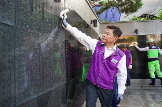 이날 이필형 구청장은 환경미화원 20여 명과 함께 참전유공자 성명 및 공적내용이 각인된 명비와 계단을 물로 깨끗이 청소하고 주변 잡초도 제거했다. 충혼의 벽에 내려앉은 먼지와 물기를 수건으로 깨끗하게 닦아낸 후, 순국선열과 호국영령에 대한 묵념과 헌화로 행사는 마무리됐다.