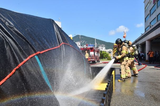 지하층에서 전기차 화재가 발생한 상황을 가정해 ▲(초기단계) 질식소화덮개 활용 연소확대 차단 ▲(확산단계) 이동식자립방수총 활용 대량방수 ▲(진화단계) 이동식소화수조 차량 침수 등 진압 상황을 단계별로 전개하며, 실전적인 화재 진압을 선보인다.