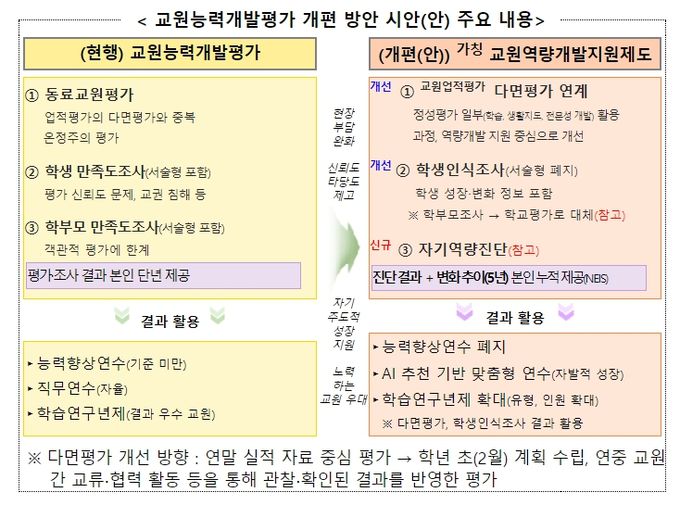 이번 교원능력개발평가 개편 방안 시안(안)의 핵심은 교원을 평가하는 관점의 기존 교원능력개발평가는 폐지하고, 교육전문가인 교원의 역량 개발을 실질적으로 지원할 수 있는 ‘(가칭) 교원역량개발지원제도’로 재설계하는 데 있다.