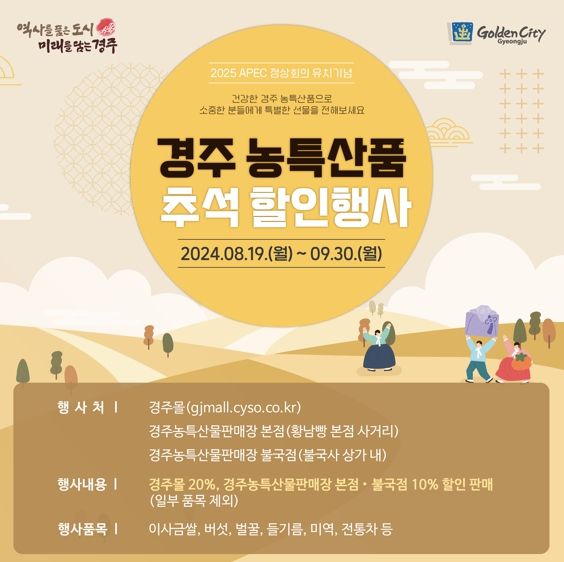 15일 시에 따르면 이번 추석 특별할인 행사는 온라인 경주몰에서 20%, 오프라인 경주농특산물판매장 본점(계림로 69)과 불국점(진현로1길 59-5)에서 각각 10% 할인 혜택을 제공한다.