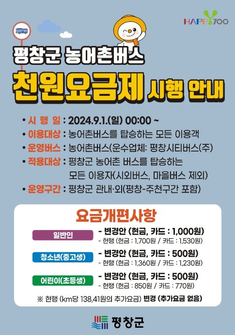 (아름다운교육신문) 평창군이 9월 1일부터 농어촌버스 운임료를 1,000원 단일요금제로 운영한다.