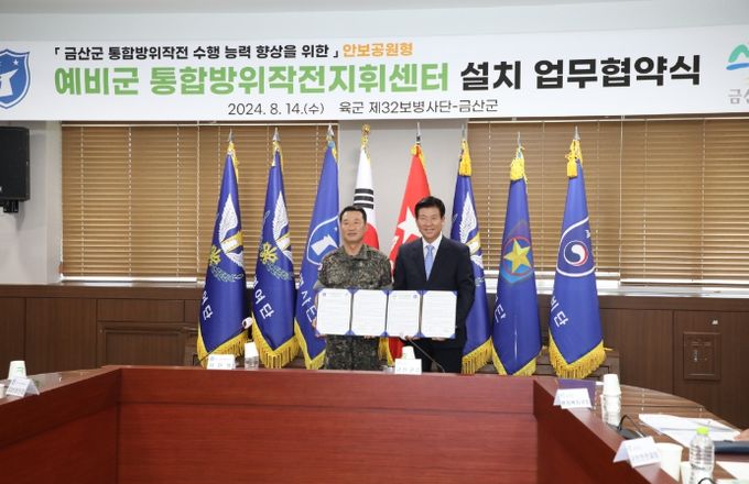 (아름다운교육신문) 금산군은 지난 14일 육군 제32보병사단과 금성면 도곡리 186-5 일원 부지를 활용한 주민 친화형 안보공원 및 예비군 통합방위작전지원센터 조성하기 위한 업무협약을 체결했다.